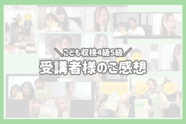【受講者様の声】こども収検5級4級のご感想こども収検5級4級受講者様のご感想をまとめたページです。こども収検に興味がある方、ぜひ読んでみてくださいね♪ \こども収検についてはこちらをどうぞ/ こども収検の...