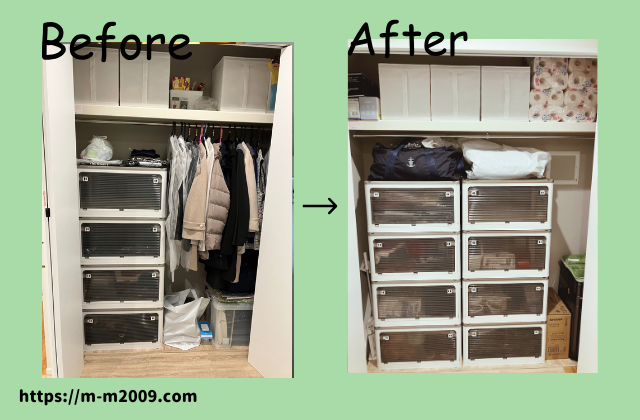 クローゼットの上棚に重いモノがあったので、安全面を第一に考え下段に移動して、クローゼット上棚には防災備蓄品のトイレットペーパーやティッシュ、ライトなど軽めのモノを収納。